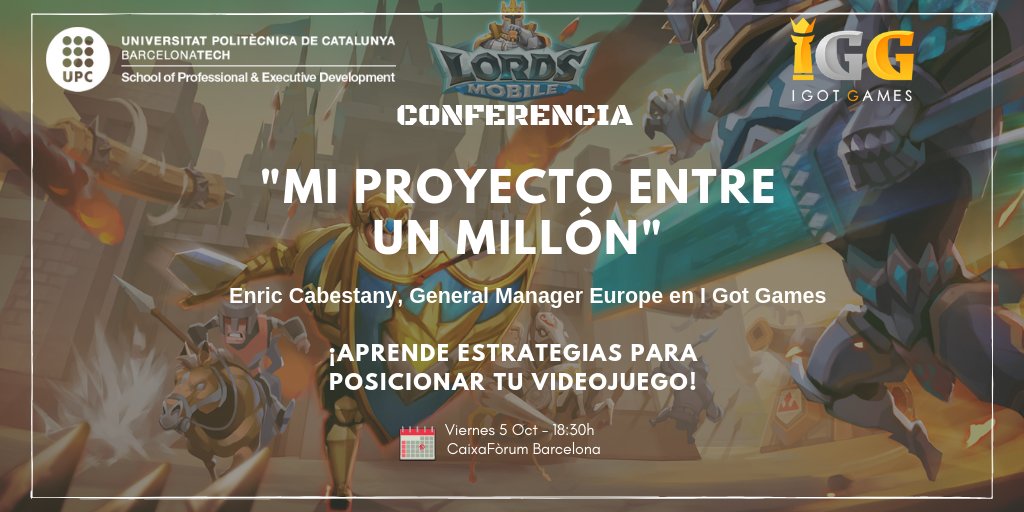 El proper divendres 5 d'octubre, a les 18:15h, tindrà lloc al CaixaForum Barcelona (Av. de Francesc Ferrer i Guàrdia 6-8, Barcelona) l'Open Talent: "El meu Projecte entre un Milió", a càrrec d'Enric Cabestany, General Manager per a Europa a I Got Games - IGG.