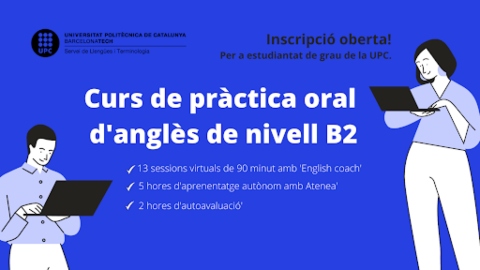 El curso, que está organizado por el Servicio de Lenguas y Terminología de la UPC y que está subvencionado (solo hay que abonar la inscripción), se ofrece en diferentes grupos, días y horarios. Consta de 13 sesiones en linea de 90 minutos y 5 horas de aprendizaje autónomo con Atenea. En caso de superarlo, obtendrás 1 ECTS. Puedes consultar toda la información aquí: